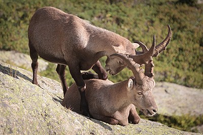 Odpoledne se vracíme podobnou trasou kolem zaparkovaného auta a stoupáme do protějšího svahu, na hřeben severně od masivu Mont Blanku. Večer se přiženou mohutná bouřková mračna. Jsou velmi fotogenická, dokud se neocitnu přímo pod nimi. Stojím pak v průtrži nehnutě asi půl hodiny v pláštěnce a snažím se ukrýt veškeré vybavení pod sebe, na útěk do stanu není ani pomyšlení. Ráno je zase až moc hezky, nejsou ideální podmínky k fotografování. Dopolední sušení nám alespoň zpestřuje párek zamilovaných kozorohů (možná je zamilovaný jen on, všimněte si otráveného výrazu v její tváři).