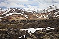 Odměnou za ranní utrpení je odpolední návštěva termální oblasti v Kerlingafjöllu. Je to asi úplně nejvíc nejlepší místo na ostrově a i když nám počasí vůbec nepřeje, vydržíme tam pokukovat přes tři hodiny. Kombinace syčících pramenů, kouřící vody, ledu a kamenů všech barev, co je schopen monitor zobrazit, je fascinující. Je to možná také nejvýše položený bod, kam se dá na Islandu dojet autem. Místní klima nám ovšem tak napráská, že se z něho celé odpoledne vzpamatováváme v nedalekém turistickém přístřešku.