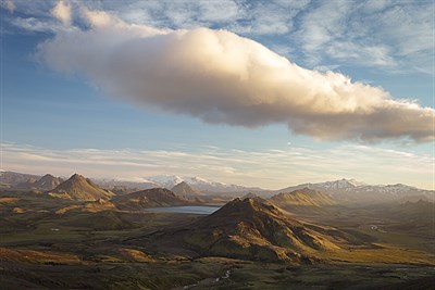 Na hraně sestupu z islandské vysočiny se otevírá nádherný výhled na bývalé sopky v okolí jezera Álftavatn, krajina se během jednoho dne naprosto mění již potřetí. Abychom nemuseli sestupovat dolů a nepřišli o tím o možnost zde večer i ráno fotografovat, stavíme na větrném svahu val z velkých kamenů, jako hradbu proti větru. Po hodině a půl namáhavé práce zjišťujeme, že stan za hradbou stejně vůbec nelze postavit. Za začínajícího šera proto sestupujeme směrem k jezeru a po krátkém hledání nacházíme snad jediné údolíčko v okruhu několika kilometrů skryté před větrem. Naprosto vyřízený automaticky zalézám do stanu a nechávám kolegu, aby se mi postaral o večeři. Díky tomu mám alespoň po probuzení více sil k tomu, abych se vyškrábal zpět do svahu a fotografoval celou scenérii i při ranním světle.